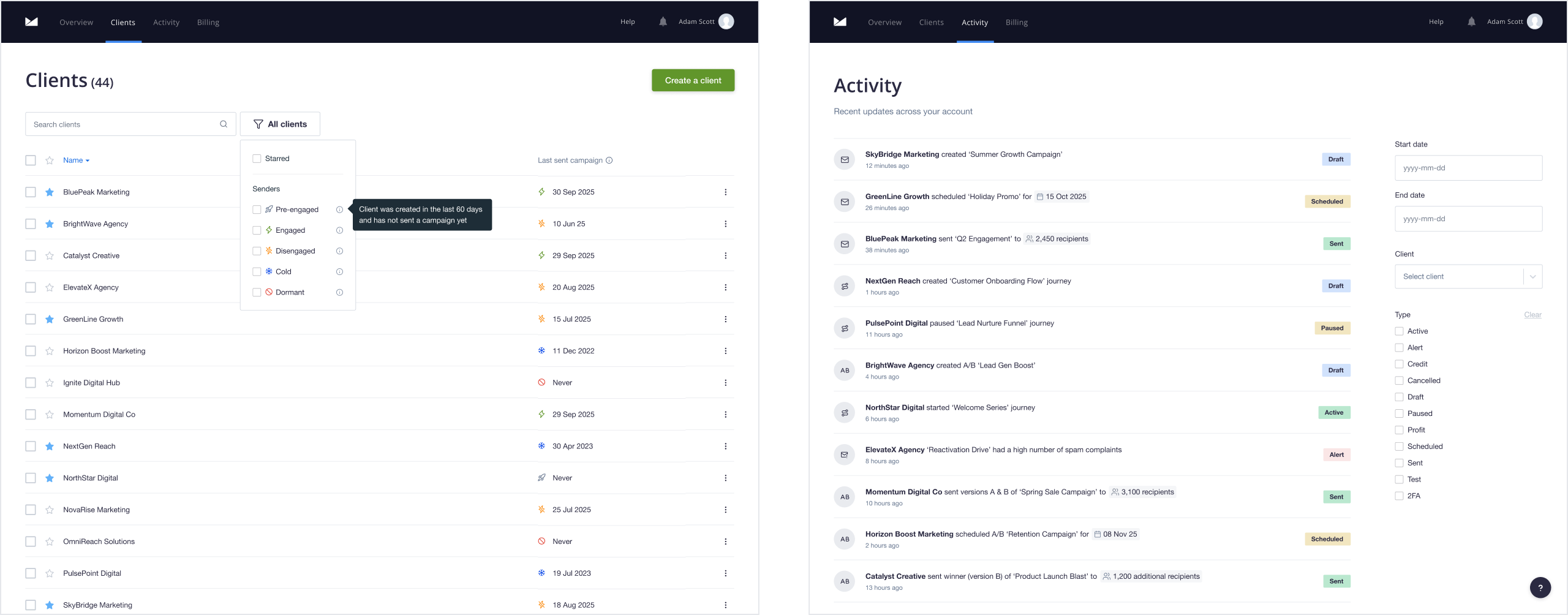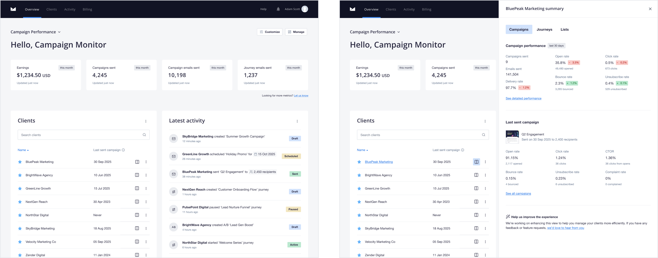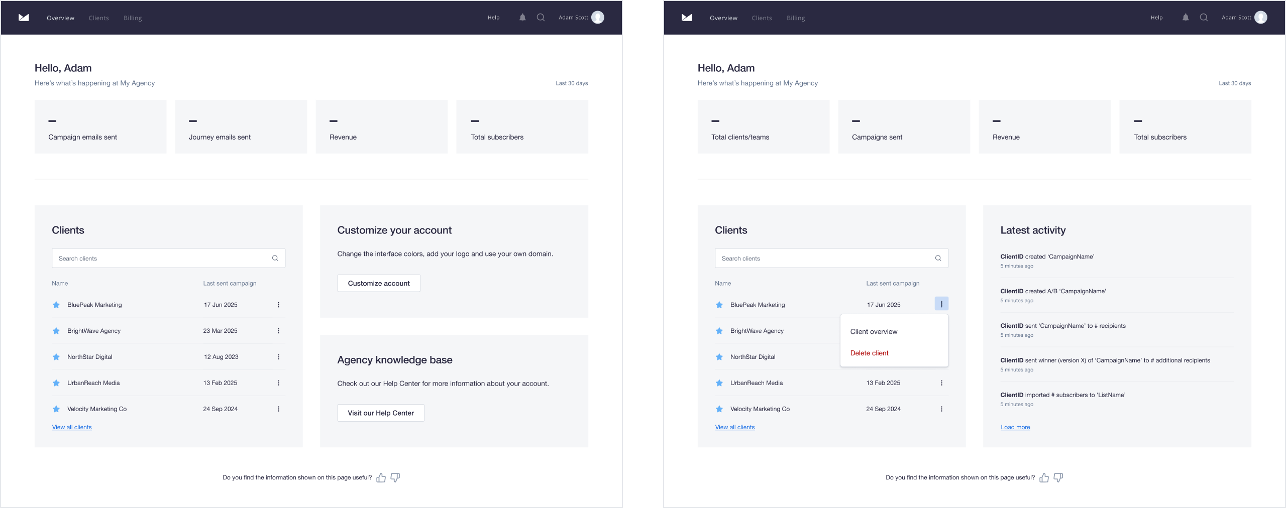 The agency account allows administrators to manage clients and campaigns from a dedicated admin area. As part of a company-wide strategic initiative, the experience was due for a complete overhaul — from how administrators navigated their client base to how they understood and acted on performance data.