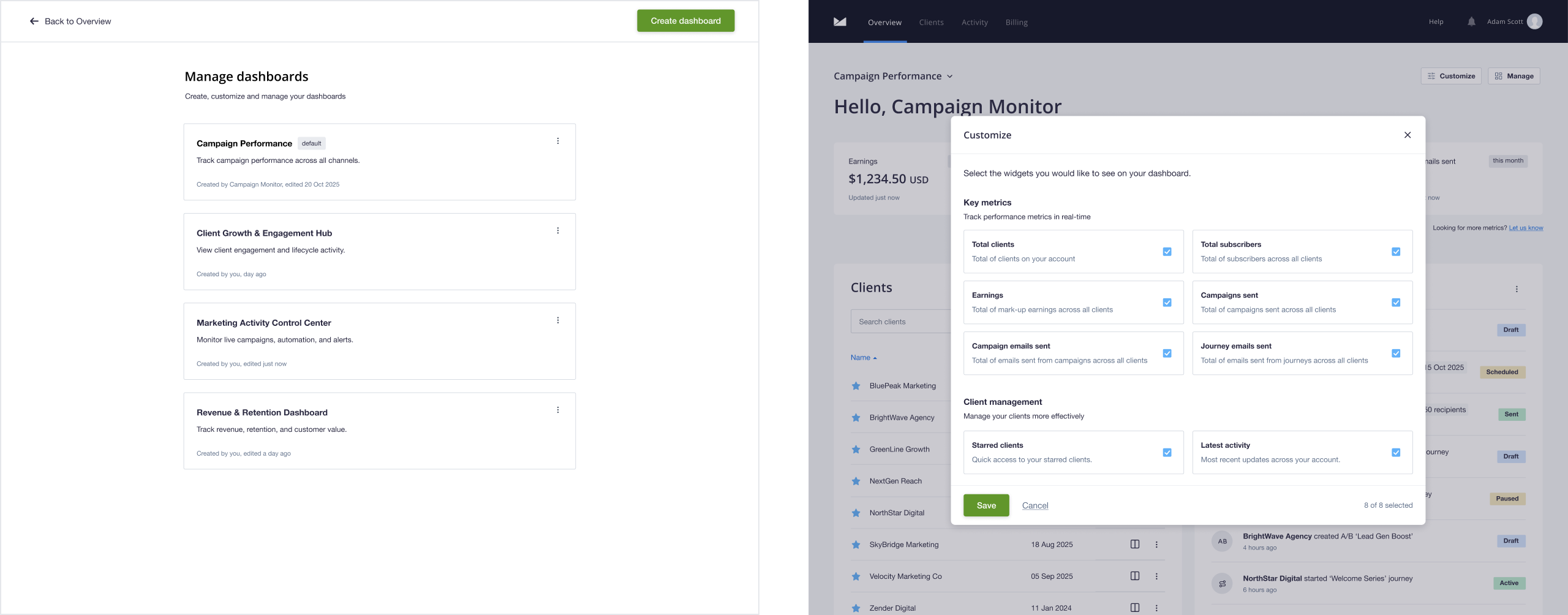The Overview page provides a holistic, consolidated view of client performance and agency-level metrics, calculated in real-time. Customisable widgets allow administrators to configure the view around the metrics that matter to their role, whether that's campaign performance, revenue, or client activity. Client and agency-level metrics detailed view is now accessible directly from the dashboard, removing the need to leave the admin area entirely.