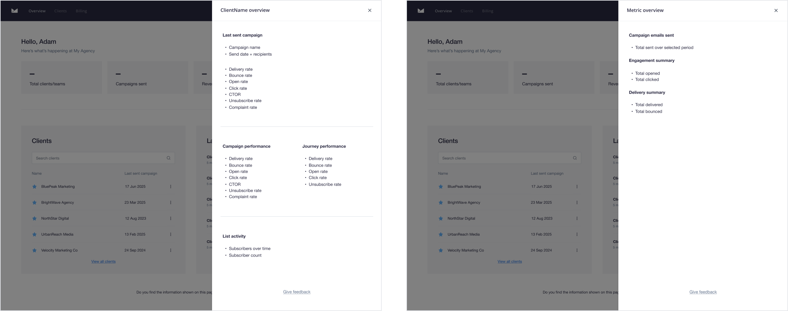 We began with a team brainstorming session to align on scope and priorities, followed by a technical investigation to establish which metrics could realistically be gathered and consolidated. We then mapped out both client and agency-level metrics to shape the direction and define the new experience core functionality. Customer interviews provided insights into agency workflows, roles, and pain points, grounding the design decisions in real user needs.