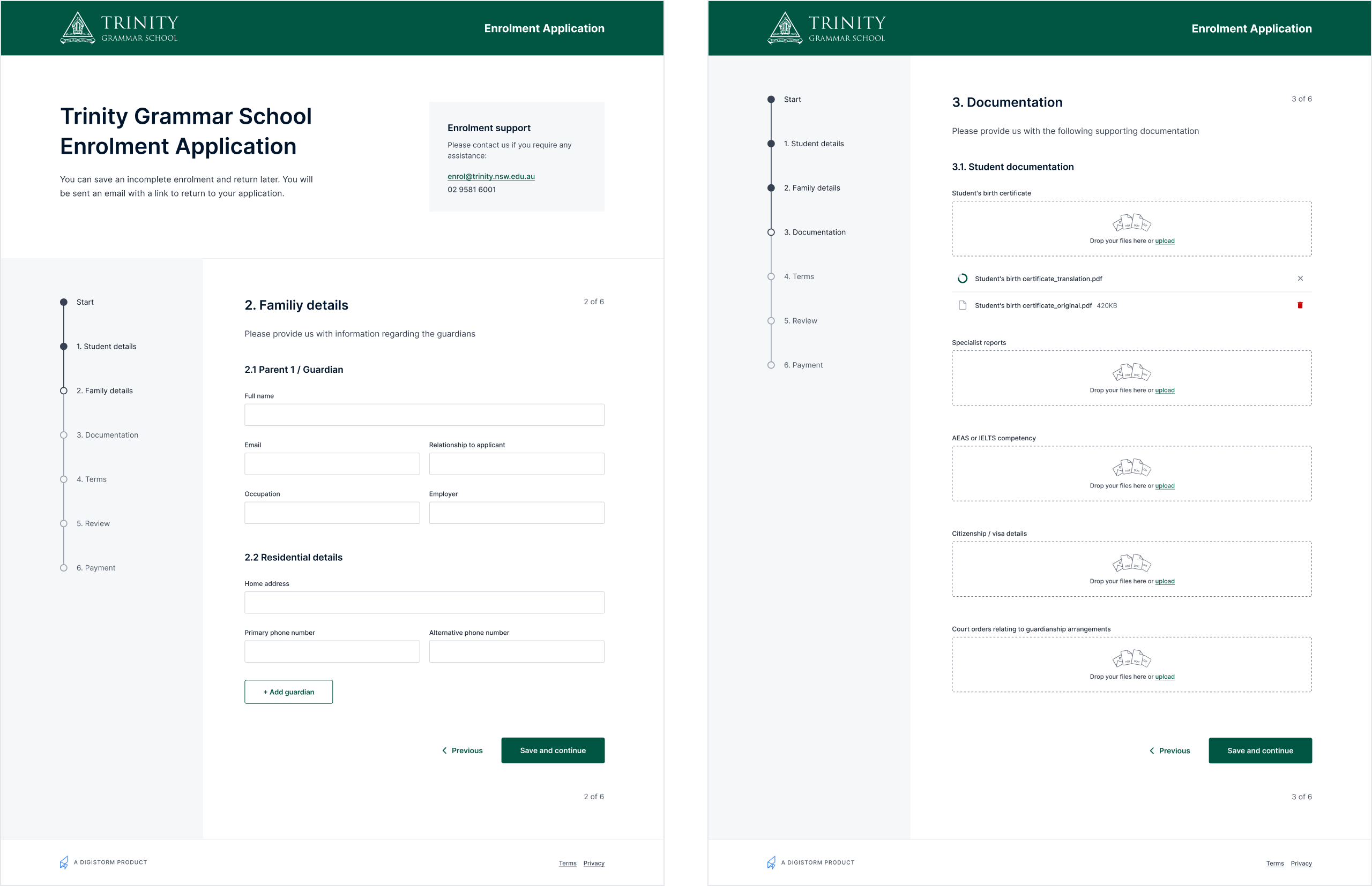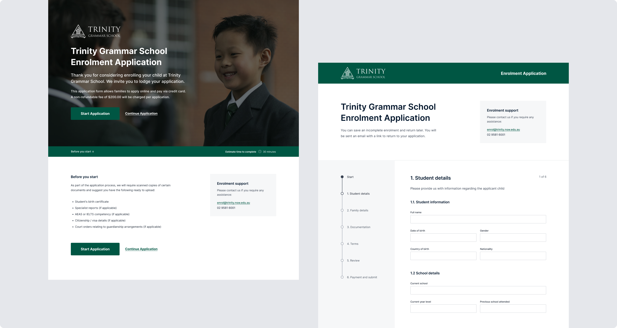 The application journey was restructured around clarity and confidence. Parents now receive upfront guidance on required documents and estimated completion time, supported by progress indicators and consistent help throughout the journey. A dedicated flow for returning applicants removes the confusion of resuming incomplete applications. Form fields, typography, and colour contrast were refined to improve readability and meet accessibility standards.