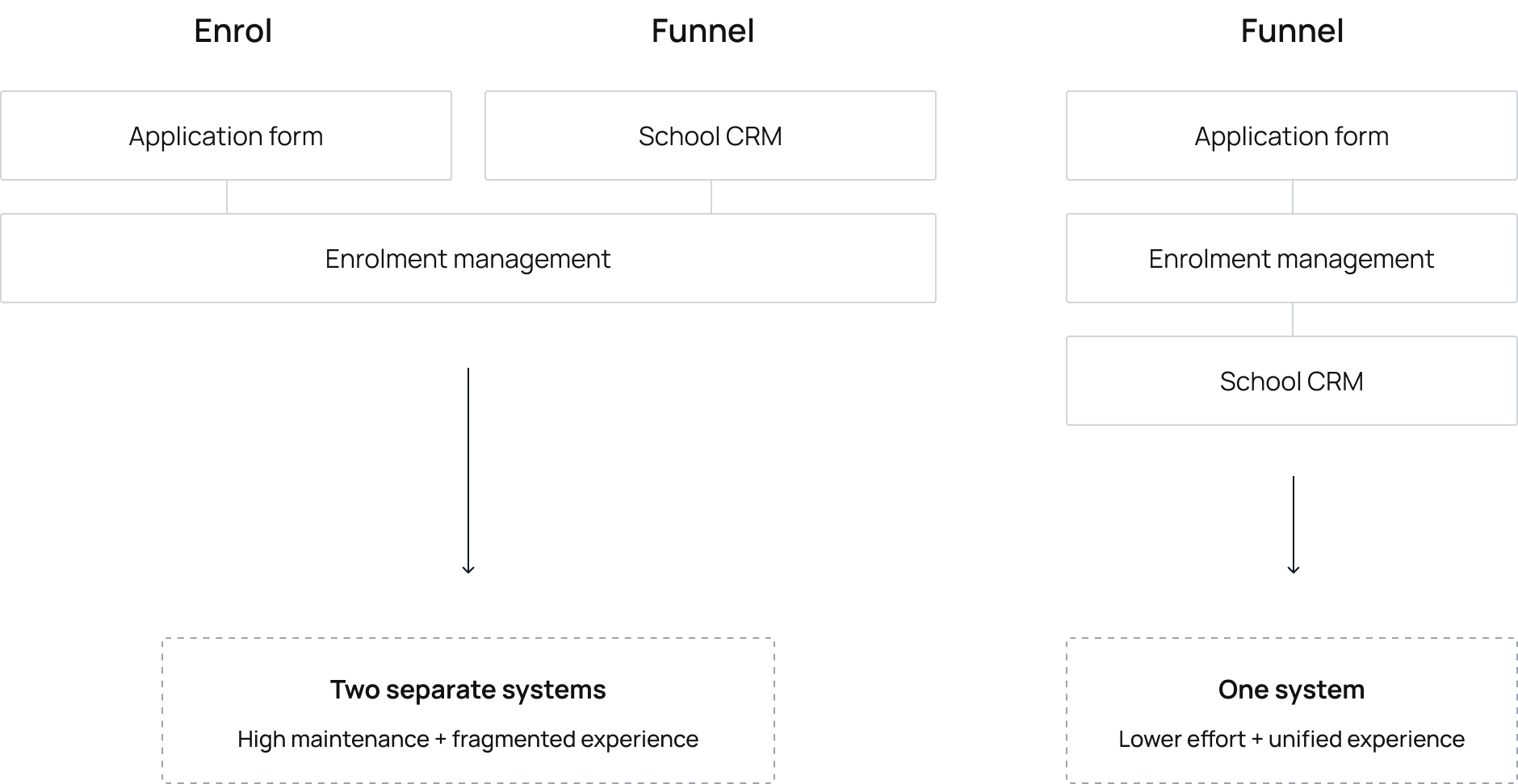 As Funnel gained popularity among schools, Digistorm decided to merge it with its existing product, Enrol — combining Funnel's back-end pipeline management with Enrol's customer-facing application process into a single, end-to-end enrolment system.