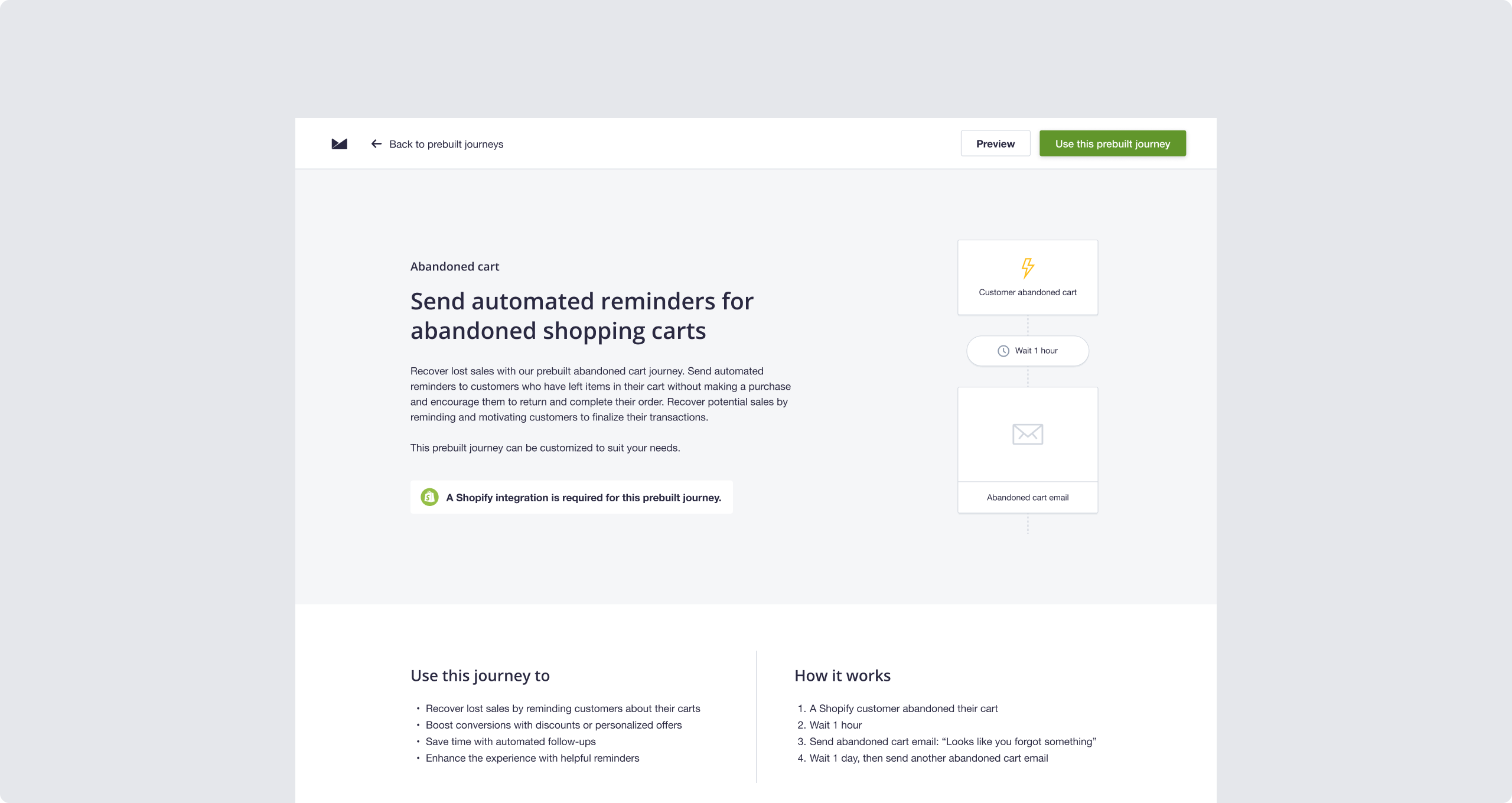 Prebuilt journeys are designed to simplify setup, allowing users to quickly customise and launch an automation with just a few clicks. The journey page plays a critical role in this process, giving users the context they need to decide whether a template is right for them before proceeding.