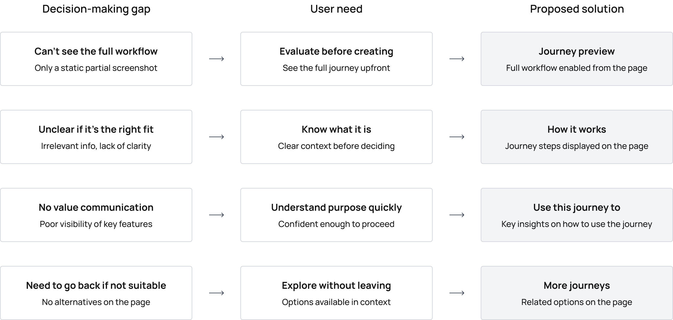 The pages weren’t supporting confident decision-making. Users were unable to preview a journey before creating one. The only available preview was a static screenshot showing the first steps of the workflow. To properly evaluate a template, users had to create a journey first.